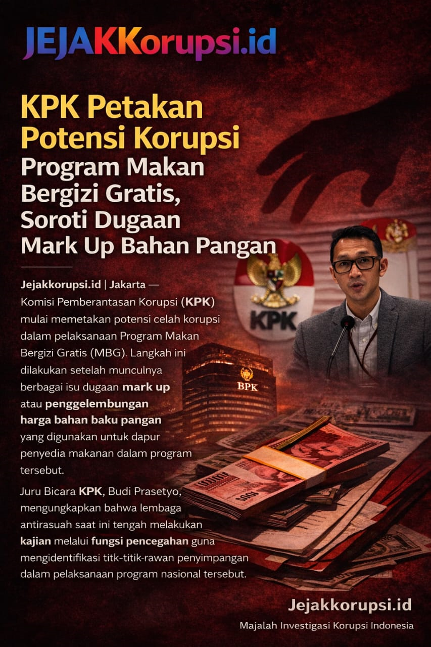 Jejakkorupsi.id | Jakarta — Komisi Pemberantasan Korupsi (KPK) mulai memetakan potensi celah korupsi dalam pelaksanaan Program Makan Bergizi Gratis (MBG). Langkah ini dilakukan setelah munculnya berbagai isu dugaan mark up atau penggelembungan harga bahan baku pangan yang digunakan untuk dapur penyedia makanan dalam program tersebut.